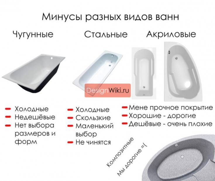 Из недостатков можно указать только на серьезный вес. Цена на такие изделия средняя, чугун дороже, чем сталь, но дешевле качественного акрила или камня.