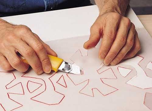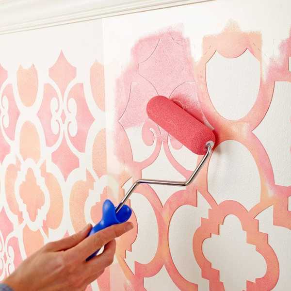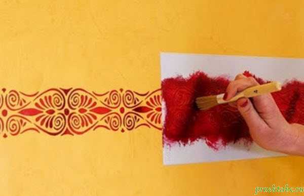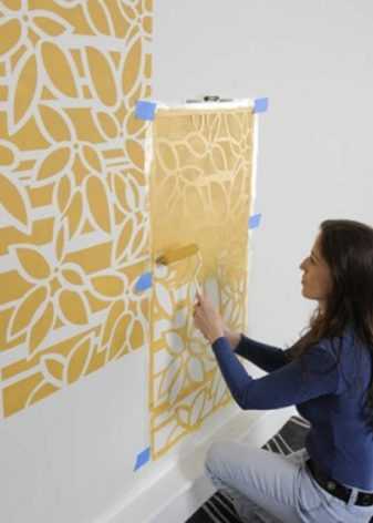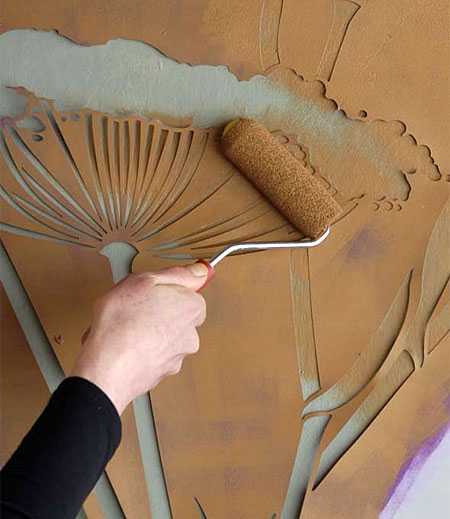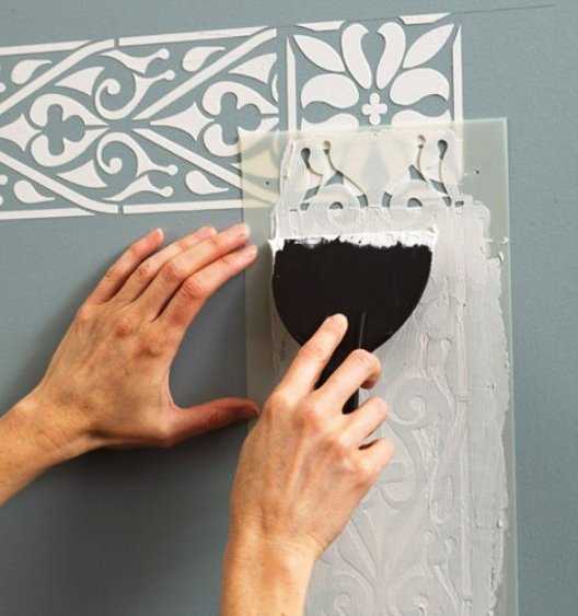 - Использование трафарета при покраске стен. Готовый шаблон можно купить в магазине, или сделать самостоятельно из крепкого материала (линолеум, тонкий пластик, искусственная кожа).