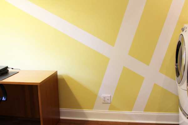 Для создания геометрического трафарета достаточно взять бумажную ленту для окон и создать задуманный рисунок. После высыхания краски отделить аккуратно ленту от стены.