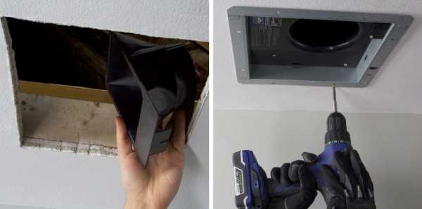 - Для установки прибора используйте уже готовое отверстие в стене. Пластиковый вентиляционный трубопровод вставить на одном уровне со стеной и укрепить штукатуркой, после чего прокинуть электропитание и установить вытяжку.