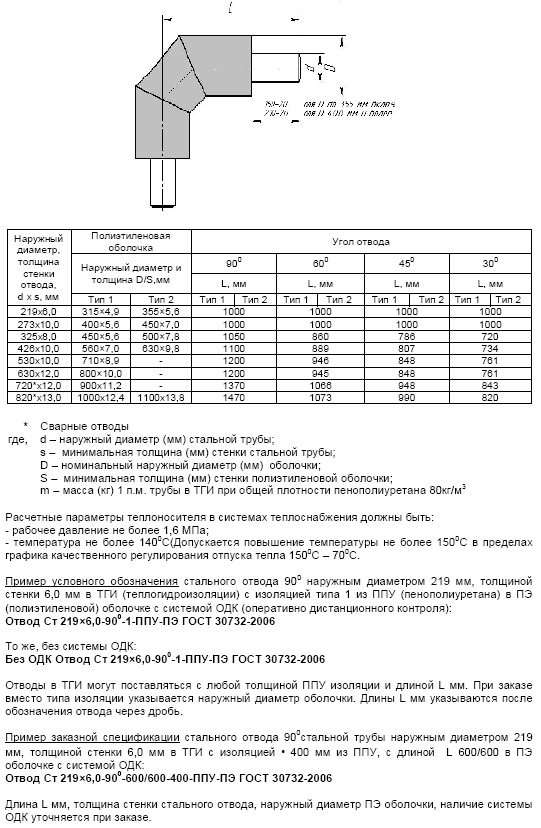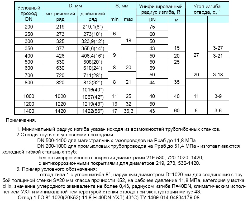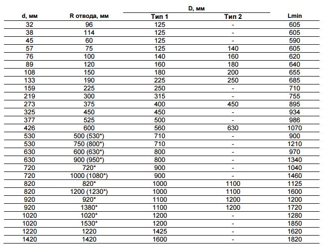 Возможно изготовление и поставка отводов исполнения 1 и 2 с геометрическими размерами, отсутствующими в таблице (см. ниже). Кроме того возможно изготовление и поставка отводов с увеличенной толщиной стенки с углами изгиба θ = 45°, 60°, 90° и 180°, а также по чертежам и эскизам заказчика.