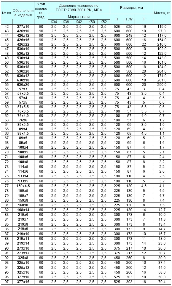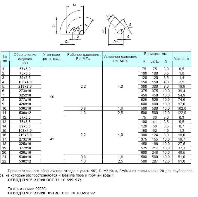 СПЕЦПРОМРЕЗЕРВ > Каталог > Вес и размеры отводов стальных ГОСТ 17375-01