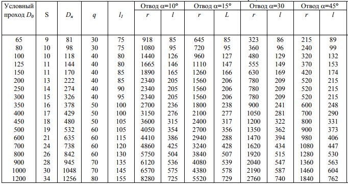 R — радиус кривизны осевой линии (радиус изгиба) отводов;