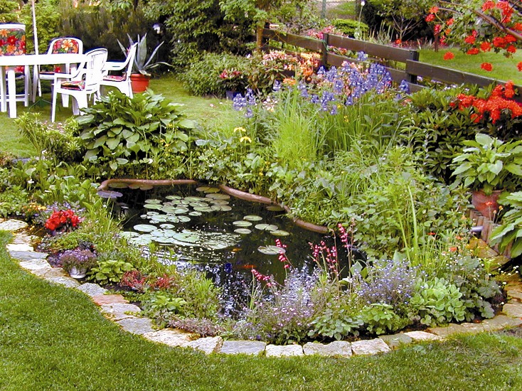 В современных садах чаще всего устраивается пруд, в котором растут водные растения, обитают рыбки и лягушки. Форма природного пруда должна быть максимально плавной. Чем пруд меньше, тем меньше должно быть всевозможных изгибов, поэтому так неестественно смотрятся водоемы в жестких формах, «берега» которых чрезмерно изрезаны и напоминают скорее фигурное печенье, чем природное сооружение. Если получился именно такой водоем, улучшить ситуацию сможет продуманная посадка растений, которые закамуфлируют неестественность берегов, в пластиковой форме. Не забывайте, что чрезмерное количество прибрежных растений, особенно крупных, визуально значительно сокращает размер водоема.