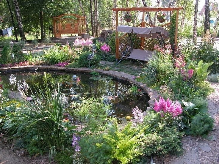 Посмотрите на фото садовых водоемов: веющая прохладой гладкая поверхность пруда, журчание ручья или фонтанчика, шелест мискантуса около пруда, игра стрекоз и водомерок, движение стайки золотых рыбок — пребывание в таком месте позволит расслабиться, спокойно подумать, пусть ненадолго забыть все проблемы.