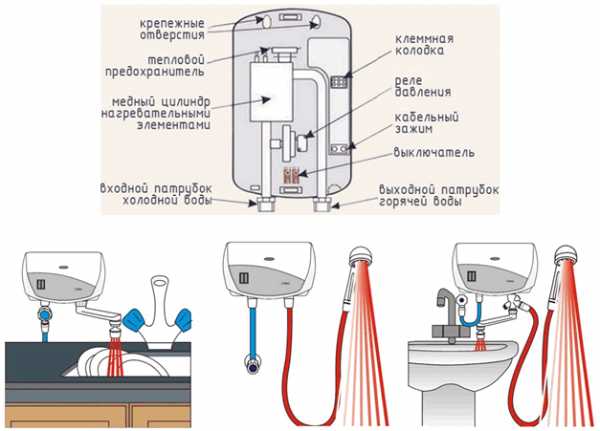 Такой прибор монтируется на мойку и подключается к водопроводу. Питание водонагревателя осуществляется от сети 220 В.