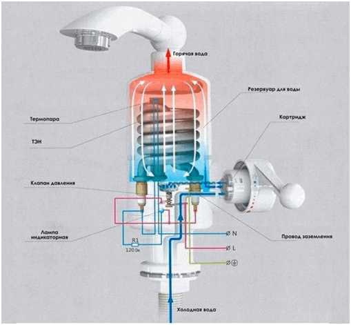Принцип работы основан на нагреве воды во время прохождения через корпус водонагревателя, в котором расположен ТЭН. Обогреватель включается автоматически при открывании крана и, благодаря малому внутреннему объёму корпуса и большой мощности ТЭНа, вода нагревается почти мгновенно — через 3-4 секунды после включения она уже тёплая на выходе.