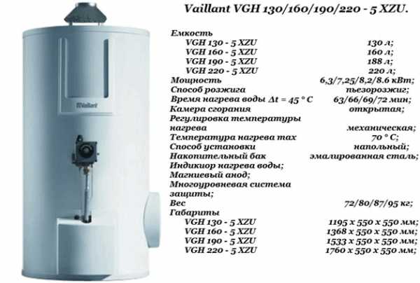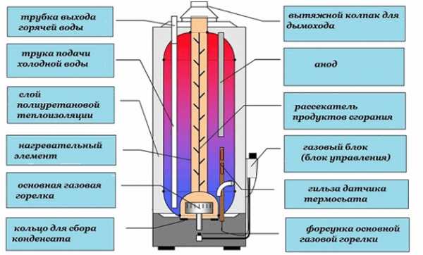 Устройство, называемое также бойлером, состоит из бака ёмкостью 50 -300 литров со встроенным теплообменником, в котором происходит сгорание газа. Продукты сгорания топлива выводятся из теплообменника через газоотводную трубу.