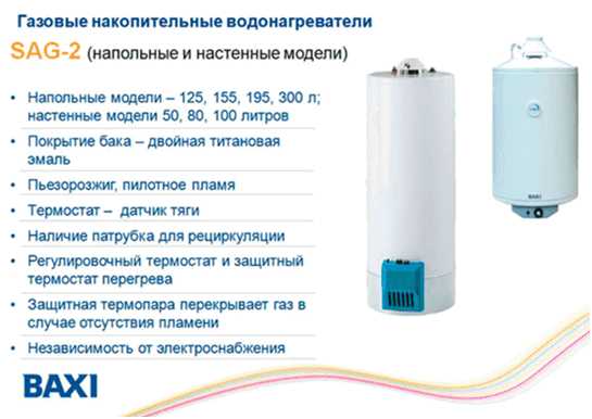 Бойлеры накопительного действия, как и газовые колонки, различаются по типу исполнения камеры сгорания (открытый, закрытый) и источнику питания устройства автоматического розжига (батарейки, пьезоэлемент, бытовая электросеть). Достоинства и недостатки, касающиеся эти комплектующих на газовых колонках, актуальны и для бойлеров.