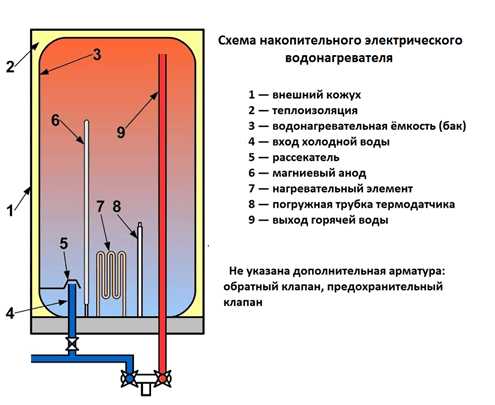 Агрегат, как и устройство на газе, представляет собой стальной бак, помещённый в корпус чуть большего размера. Между стенками бака и корпуса устроена теплоизоляция, как у термоса. В нижней части ёмкости установлен ТЭН с термостатом и два патрубка – приёмный для холодной воды и выходной для горячей.