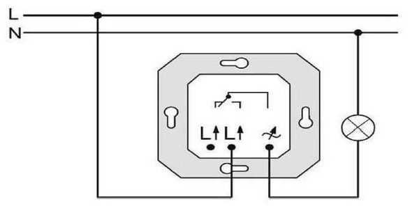 Самая простая и распространенная схема состоит из диммера и ламп, которые подключены к нему последовательно. Светорегулятор ставится в разрыв фазного провода, обозначаемого маркировкой «L». При этом один провод из распределительной коробки подключается на клемму «L» с указанием стрелки наверх, а второй провод – на обозначение «~» со стрелкой под наклоном. По этой схеме диммер устанавливается вместо обычного выключателя.