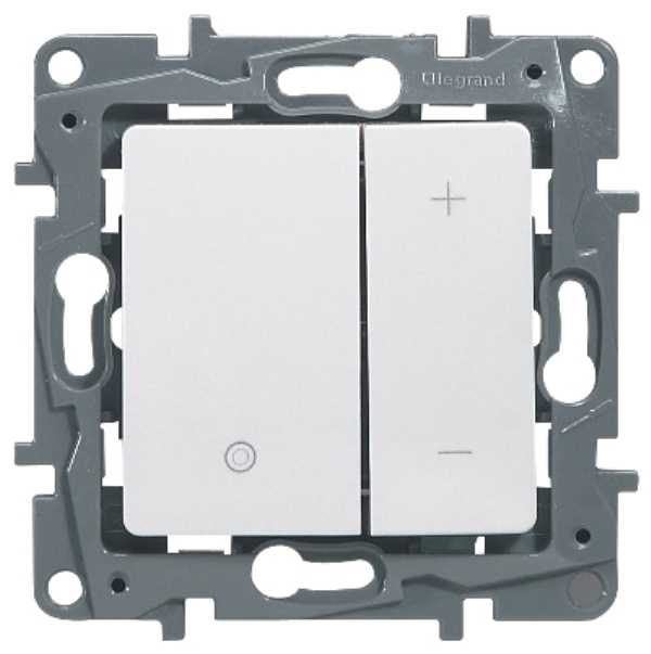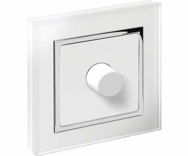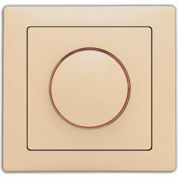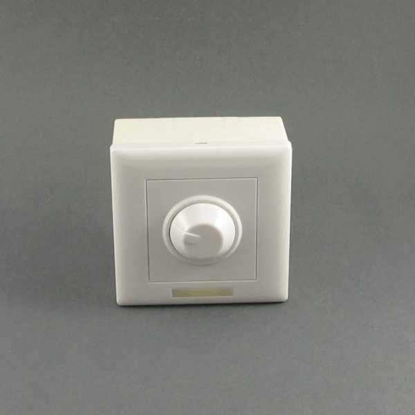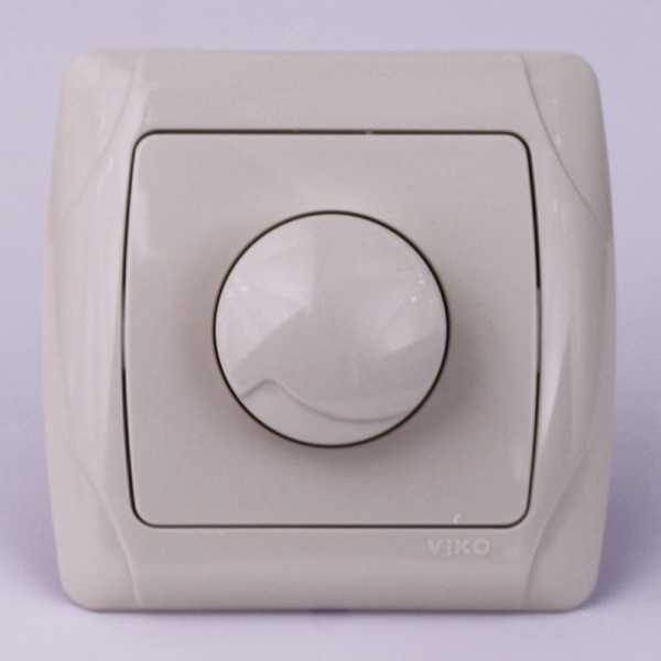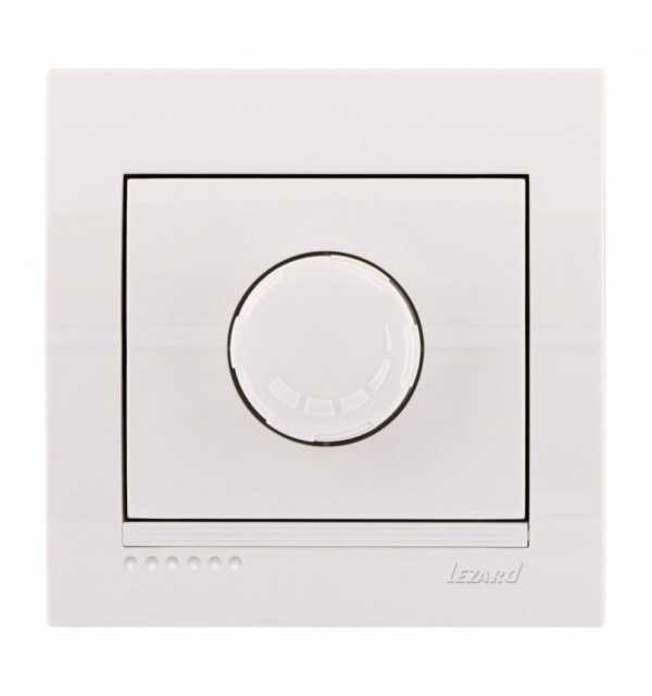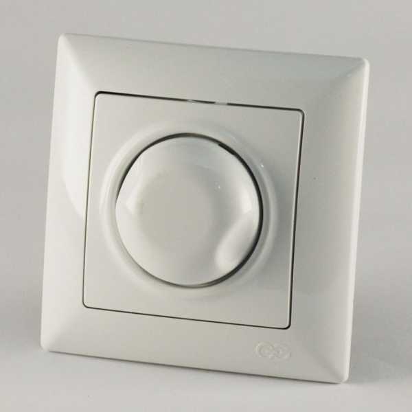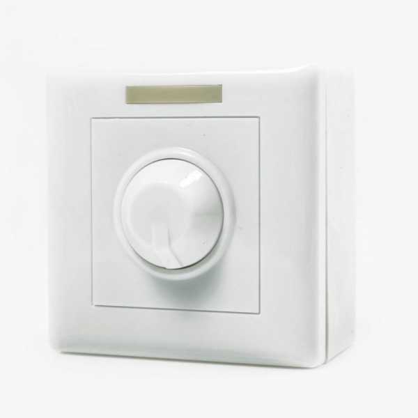 - Моноблочные – самый распространенный вариант, по виду похож на обычный выключатель, ставится в ту же монтажную коробку, что и он. Включаются в разрыв фазы, работают с лампами накаливания, галогеновыми, а электронные – со светодиодными. Управляются с помощью поворотного диска, поворота с нажатием или клавишами. Самые надежные модели из моноблочных регуляторов света – это сенсорные, управляемые с помощью прикосновения.