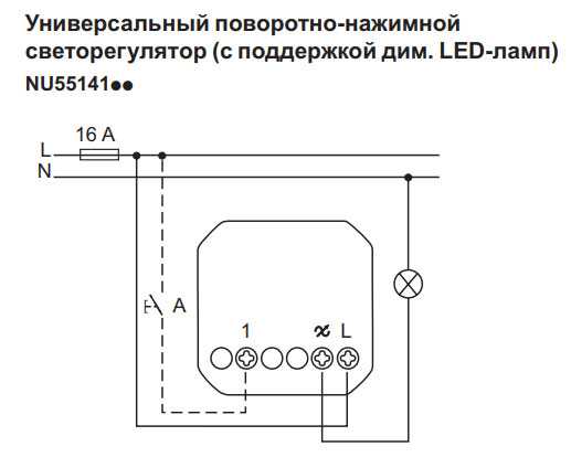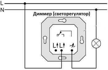Начнем с самой распространенной и простой схемы, состоящей из одного диммера и одной или нескольких ламп, подключенных к нему последовательно. Только помните, что диммер ставится только в разрыв фазного провода (обозначается L), а не нулевого (N).