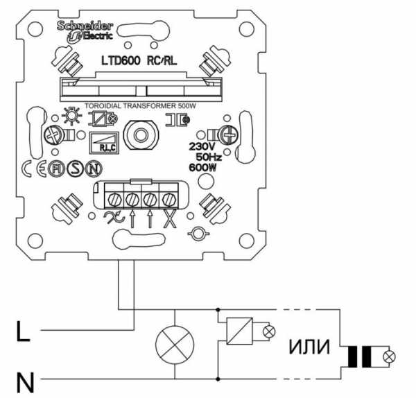 - Одновременное подсоединение к диммеру нагрузки емкостного и индуктивного характера запрещается.