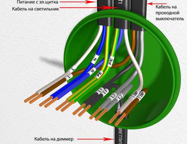 Для монтажа проходного диммера потребуются те же самые материалы, только кабель должен быть обязательно 3-х жильным. Этапы работ практически повторяются.