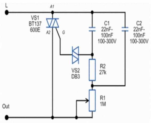 Это самая простая схема, которая при необходимости позволяет быстро заменить обыкновенный выключатель на диммер.