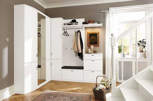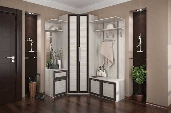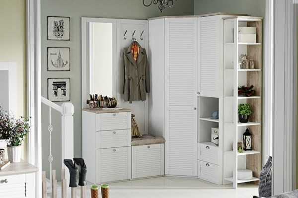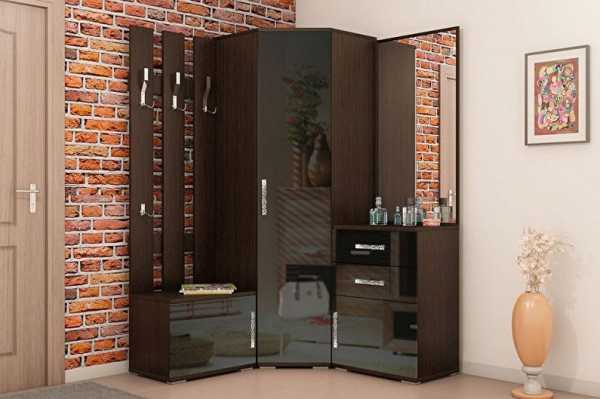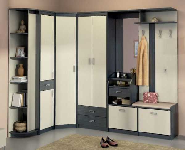 Модульная прихожая: угловой шкаф можно дополнить самостоятельно подобранными тумбочками и стеллажами. Найдите в интернете фото уже готовых модулей, это облегчит выбор Дополнительные элементы приобретаются отдельно или изготавливаются на заказ. Этот вариант применим даже для маленьких помещений. Большим плюсом является возможность максимального удовлетворения потребностей и вкусовых предпочтений.