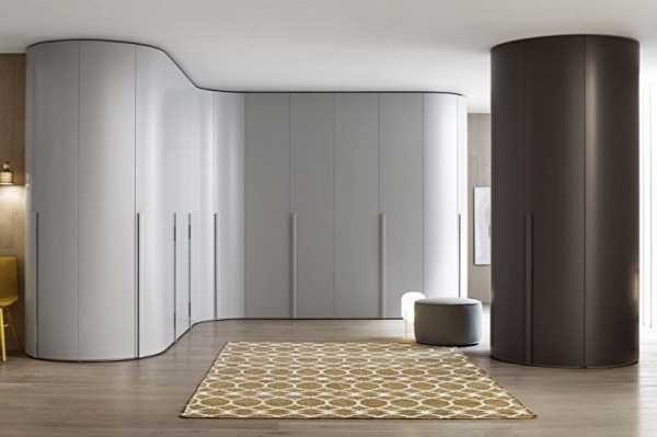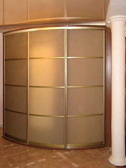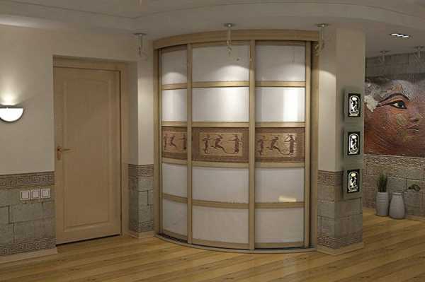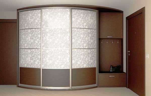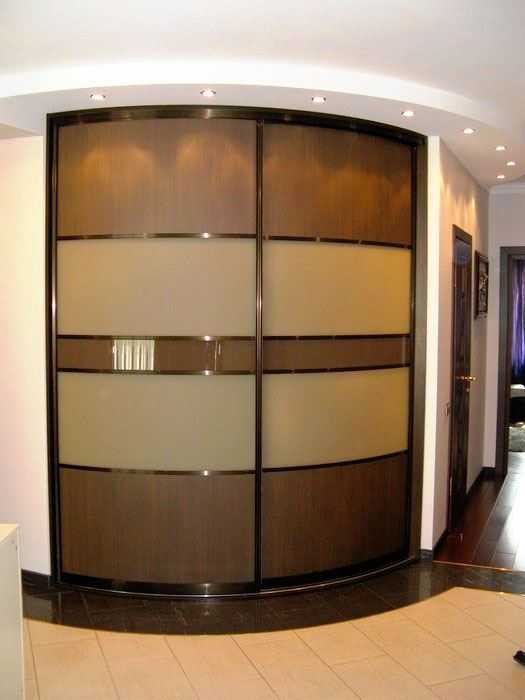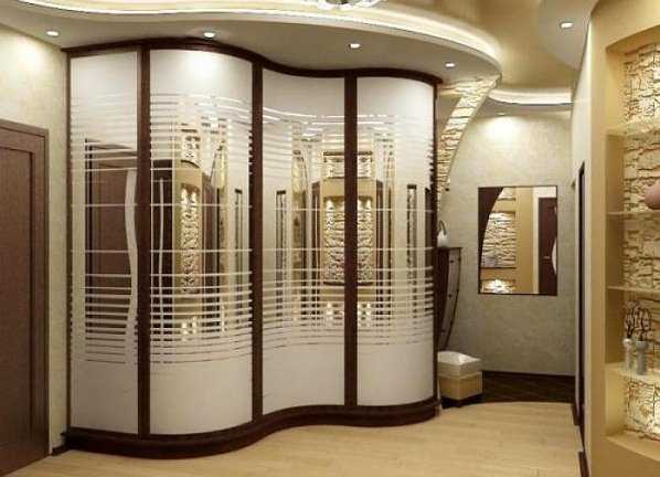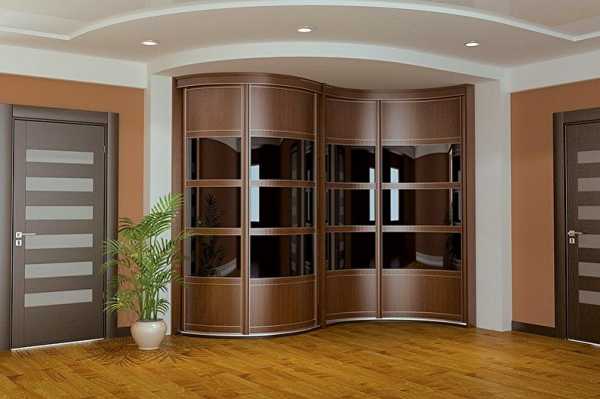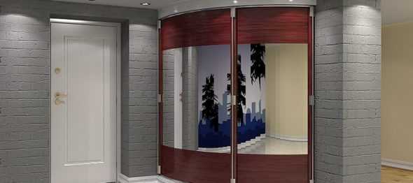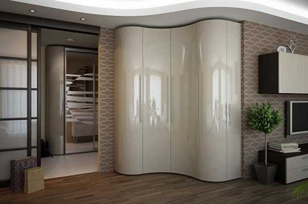Радиусный шкаф – отличное решение для квадратной прихожей. Его плавные полукруглые фасады с раздвигающимися дверцами смотрятся красиво и необычно. Данная конструкция в условиях небольшого помещения обеспечит максимальную безопасность, так как здесь отсутствуют углы, о которые можно удариться. В больших прихожих радиусный шкаф-купе может играть роль целой гардеробной комнаты, так как имеет большую глубину;