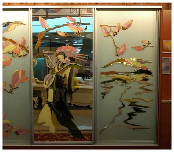 Фасад из матового стекла с фотоизображением. Достаточно смелое и красивое решение, которое может преобразить дизайн комнаты. Обычно такими фасадами оснащают шкафы-купе. Чаще всего такая мебель изготавливается на заказ, но можно встретить уже готовые изделия в магазине. Можно выбрать любое изображение или фото для фасада, будь то крупные или мелкие цветы, пейзажи, абстрактный рисунок. Идеальное решение для любителей ярких и сочных красок. Подходит для тех, кто может гармонично сочетать цвета.