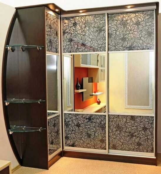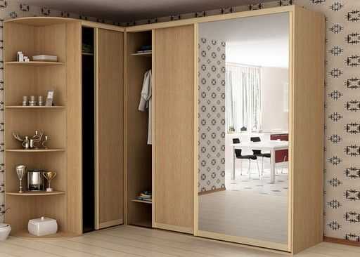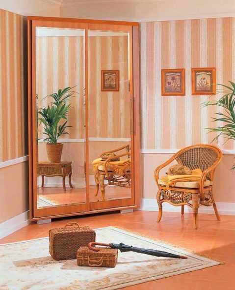 - Угловой шкаф помогает освободить пространство, а если на фасаде его есть зеркало, он еще и зрительно увеличит помещение;