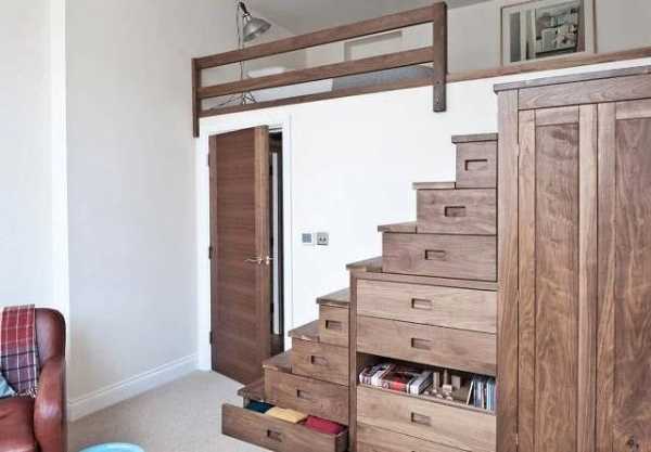 - Лестница для подъема может стать дополнительным местом для хранения вещей. Для этого ступени комплектуют выдвижными ящиками или распашными шкафчиками. Комплекс может быть дополнительно укомплектован целой системой шкафов и полок, что особенно удобно для детских комнат.