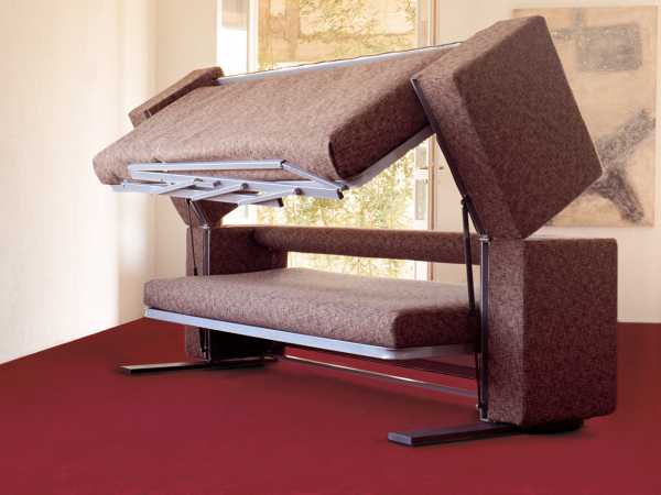 Процесс трансформации дивана в двухъярусную кроватьИнтересно, что такой диван производят в России. При необходимости двухспальный предмет мебели раскладывается так, что превращается в двухъярусную кровать с двумя односпальными местами. Занимательнее было бы, если такая кровать могла трансформироваться в двуспальный диван. Такой вариант стал бы настоящей находкой при экономии места.