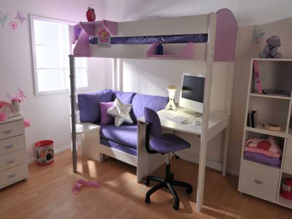 - Кровать-чердак с диваном – хорошее решение для детской с 2 разновозрастными детьми. В этом случае гости старшего ребенка не сидят на постели младшего. А старшему будет комфортнее спать на раскладном диване, чем на узкой кровати. Возможность сложить его позволяет освободить место для игр днем.