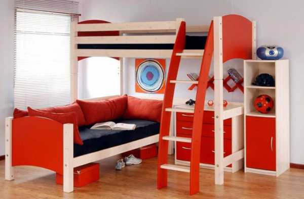 Двухъярусная кровать с диваномДизайн двухъярусных кроватей со встроенным диваном может сильно варьироваться. Мне например очень приглянулся вот такой: в «техно» стиле. Контрастный оранжевый цвет стильно смотрится в сочетании с металлическими трубами.