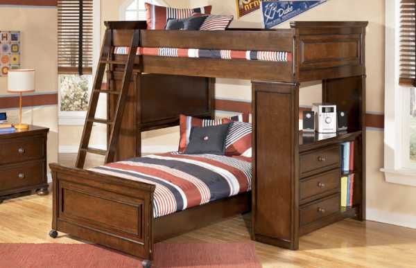 Для повышения безопасности для детей выбирают конструкции с удобной пологой боковой лестницей с перилами или примыкающую к стене. Например, из тумб для хранения вещей. Бортики верхнего яруса должны быть достаточно высокими – не ниже 30 см от матраса – и усиленной прочности.