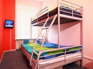 Двухъярусная кровать в отелеДля одиночного проживания в малометражной квартире наиболее подойдет одноместная кровать на втором ярусе, под которой можно организовать рабочее место. Отлично подойдут двухъярусные кровати для маленьких гостиниц и общежитий.