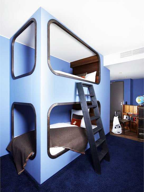 Идея двухъярусных кроватей быстро набрала популярность, и дизайнеры смело шагнули дальше. Они предлагают новый способ зонирования пространства: спальное место или зону отдыха обустроить «под потолком».