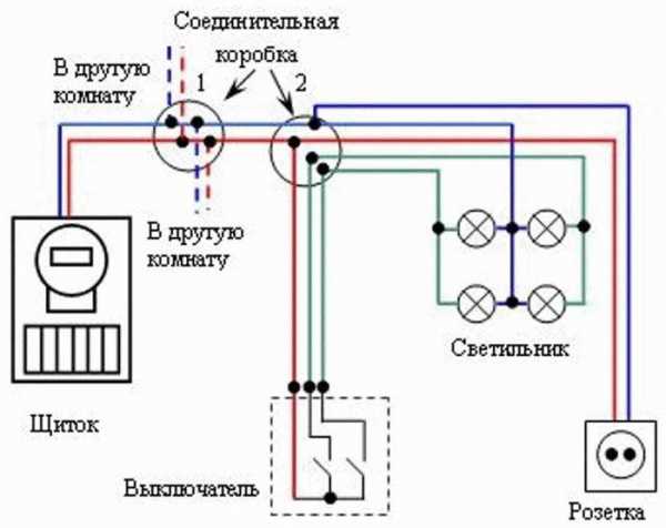 Для подключения осветительной лампы к сети с использованием выключателя обычно используется распределительная коробка, в которой производится коммутация. При этом к ней подходит 6 электрических линий – по двум подается напряжение, две идут к лампе и две идут к выключателю.