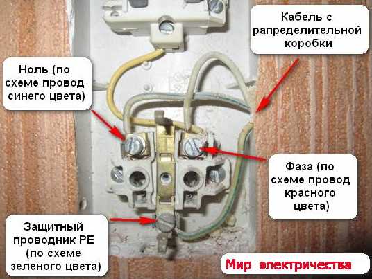 Ноль и фаза подключаются непосредственно к розетке. Соответствующие контакты промаркированы на колодке устройства. Здесь, в отличие от одиночной розетки, взаимное расположение нуля и фазы имеет значение. По нормам безопасности выключатель размыкает фазный провод, а нулевой проводник подводится напрямую к светильнику.