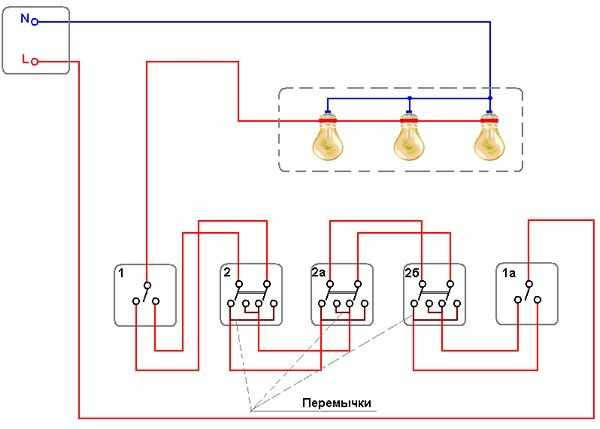 Когда для удобства и экономии электрической энергии есть необходимость управления светом двух лампочек (двух групп ламп) из трех мест и более, используется схема, описанная в предыдущем пункте, но более усложненная. Каждый из клавишных выключателей (каждая точка), кроме первого и последнего, снабжается двумя перекрестными переключателями тока. В начале цепи один раздвоенный контакт (пара контактов) по схеме уходит на первый, так называемый перекрёстник, а вторая – соответственно, на второй перекрёстник.