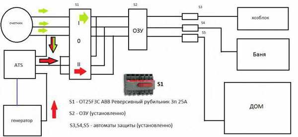 Включение происходит по простой схеме: к первому контакту подсоединяют центральную токопроводящую линию, ко второму — дизельный или бензиновый генератор. Наиболее востребованные переключатели считаются на 2 и 4 полюса. Основные правила подключения рубильника в помещении от трехфазного электропитания: