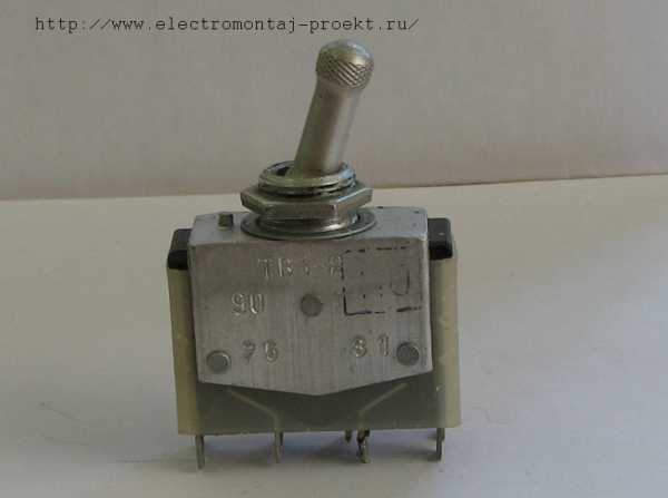 Перекидные выключатели. Их название произошло от английского слова tumble – опрокидываться. В основном это малогабаритные тумблеры, используемые чаще для коммутации различных цепей управления. Иногда их используют в приборах для включения питания. Одна из разновидностей перекидного выключателя показана на Рис. 4.