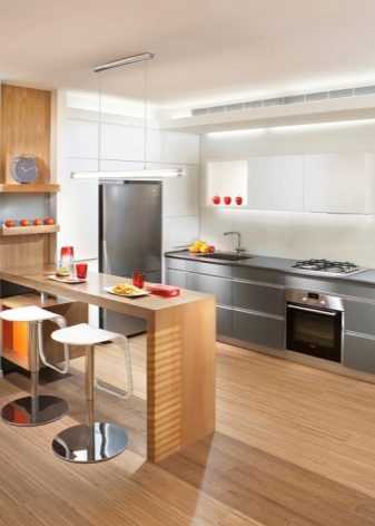 Можно поднять столешницу еще больше, но только в том случае, если нужно визуально разделить зону кухни и гостиной, но это вовсе не обязательно. Если кухня отличается низким потолком, то высокая барная стойка усугубит ситуацию еще больше. Мебель будет некрасиво контрастировать на общем фоне комнаты.