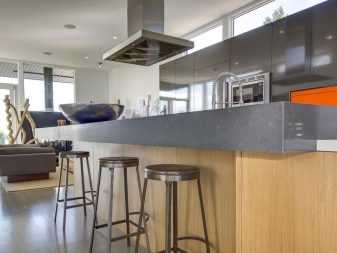 Материал должен соответствовать тому, который использовали для производства столешницы. В случае, когда стойка является продолжением кухонного гарнитура, лучше использовать искусственный камень.
