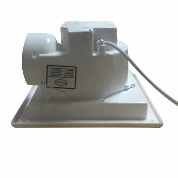 Настенная осевая вытяжка с обратным клапаном, который автоматически закрывается при выключении электропитания. В комплектацию прибора входит таймер отсрочки выключения, который может быть установлен на время до 20 мин.