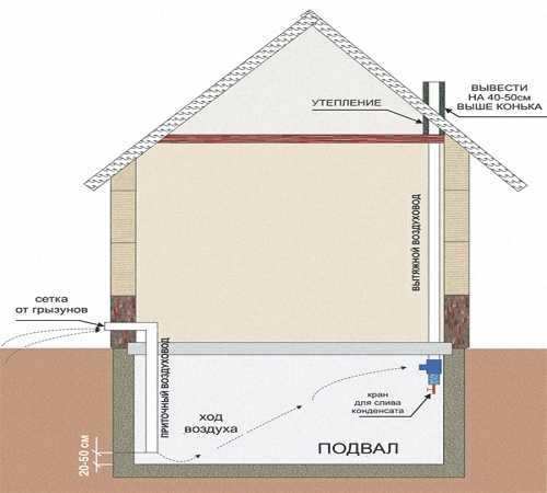 - отверстие, через которое свежий воздух попадает в помещение, должно располагаться на 100 мм от нижней части пола, а сам воздуховод поднимается над полом на 300 мм, чтобы с системе не находились насекомые, насекомые, грызуны, рекомендуется устанавливать специальные сетки на отверстия;