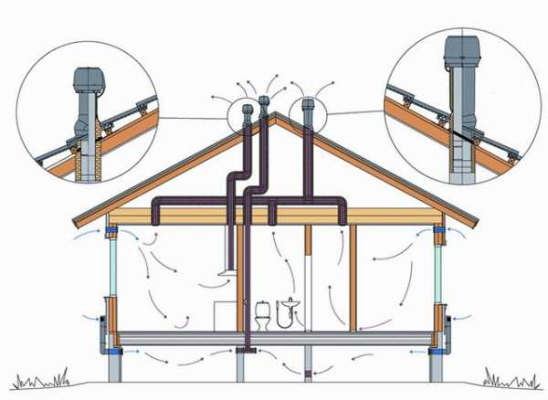 Приток воздуха происходит через форточки, приоткрытые окна, отверстия под дверями, а вытяжка – через воздуховоды, установленные в верхней части стен или в потолке и выведенные над кровлей