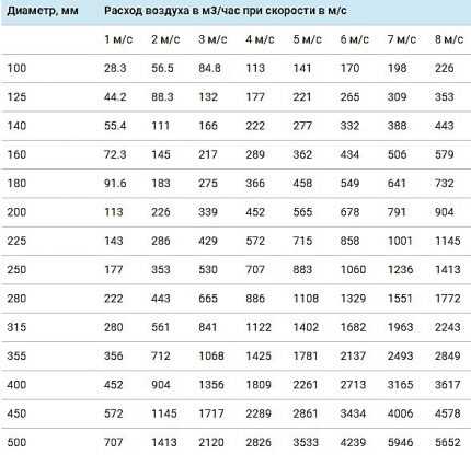 По этому показателю можно подобрать ближайший внутренний диаметр вытяжки из стандартного ряда d = 200 мм. Такое же сечение должно иметь приточное отверстие.