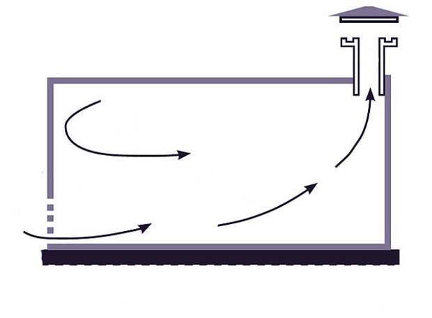 Схема приточной вентиляции.Отрицательной стороной естественного вентилирования считается невысокая эффективность. Это связано с тем, что такая система находится в большой зависимости от самых разных факторов, а этого недостаточно, чтобы бороться с выхлопами и всевозможными испарениями.