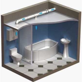 Перед монтажом необходимо составить схему разводки воздуховодов и приобрести все необходимые элементы системы- Вентилятор является основным составляющим системы и может быть встроен в стену или потолок, а также в короб воздуховода. В воздуховод прибор встраивается обычно в случае планируемого монтажа сложной вентиляционной системы. Например, если ванная и туалет разделены (или даже разнесены) между собой, то в каждом из помещений можно будет устроить собственное вентиляционное отверстие, от которого отводятся короба или трубы, подключенные затем к единому воздуховоду, оснащенному канальным или радиальным крышным вентилятором.