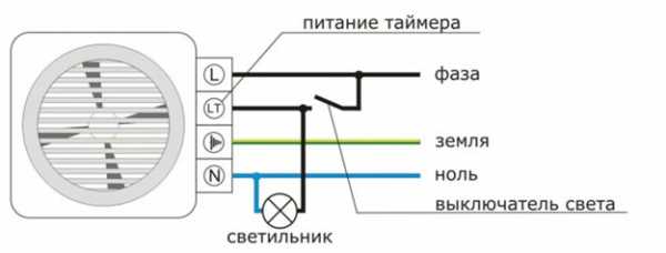 Если принято решение произвести соединить вентилятор с выключателем света, то следует осуществлять эту коммутацию примерно так, как показано на этой схеме: