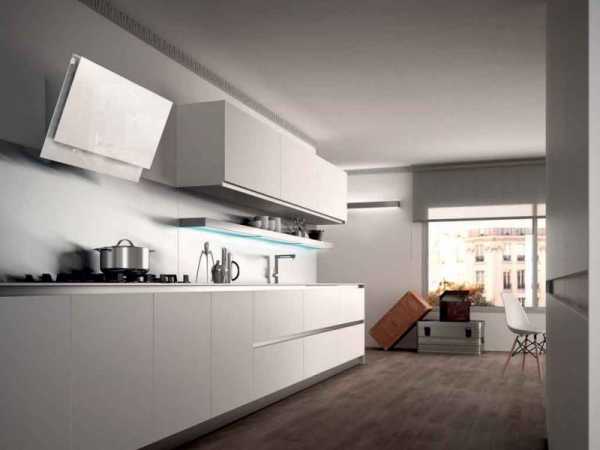 Обычно кухни со встроенной вытяжкой фото отличаются гармоничным обликом, ведь встроенная техника скрыта от посторонних глаз. Внутри ниши в шкафу или тумбочке можно смонтировать встраиваемую модель вытяжного устройства. Она очень эффективна за счет выдвижной панели, что увеличивает рабочие поверхности.