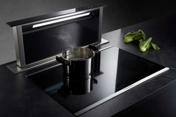 Стандартная выдвижная вытяжка также неплохо экономит место. В данном случае рабочая поверхность может быть спрятана в тот же шкаф или столешницу, что значительно экономит свободное пространство. При необходимости дополнительной вентиляции, вытяжка выдвигается над плитой и включается.