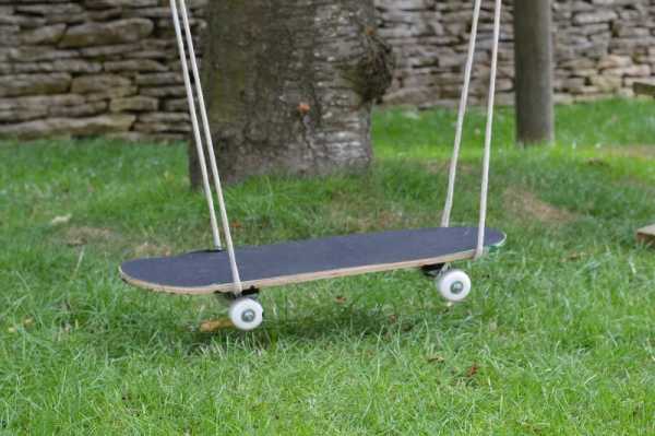 Интересные качели можно изготовить из старого скейтборда. Это будут качели типа лодочки. На них можно раскачиваться стоя.