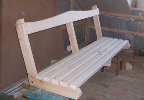 Сначала изготавливают каркас. Для этого соединяют бруски под углом примерно 100-110 градусов. Лучший вариант — это скрепить бруски в полдерева с помощью столярного клея и болтов. После высыхания клея на каркас крепят бруски, которые будут выполнять роль сиденья, их можно закрепить саморезами.