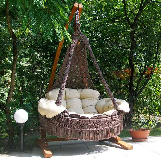 Подвесные качели-гамак станут любимым местом для тех, кто любит уединение. Их можно установить на веранде или в саду, в этом случае к ним придется приобрести или изготовить опору для подвеса.